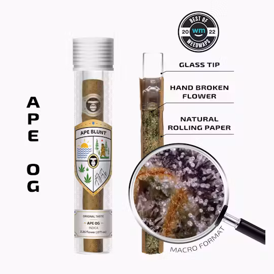 Each APE Blunt is expertly crafted, featuring a glass tip for a smooth and refined smoking experience. Hand-broken flower ensures a pure and consistent burn, while the wrap made of hemp paper adds to the natural, authentic flavor.